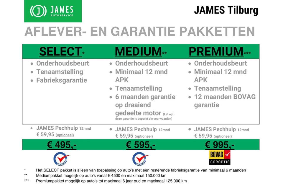 JAMES Autoservice Tilburg is al meer dan 35 jaar een begrip in TILBURG en omgeving. Kijk voor meer informatie over ons bedrijf, ons aanbod auto's en meer foto’s op onze website WWW.JAMESTILBURG.NL. Informeer naar onze aflevering- en garantiepakketten vanaf 495 euro. Alle moeite is genomen om de informatie in deze advertentie zo accuraat en actueel mogelijk weer te geven. Er kunnen echter geen rechten worden ontleend aan fouten in opties & accessoire lijst.