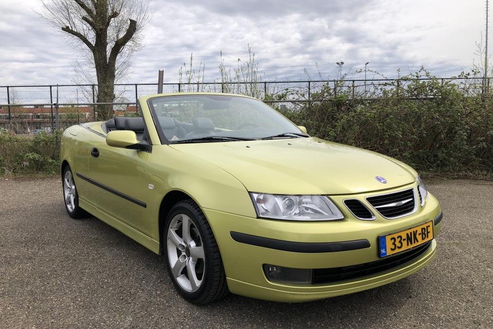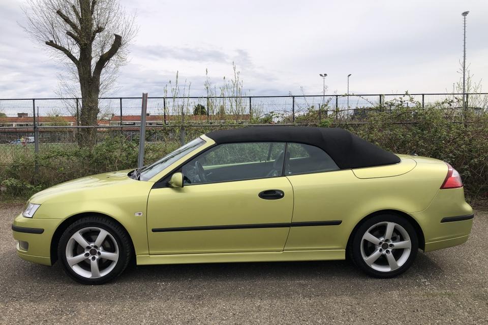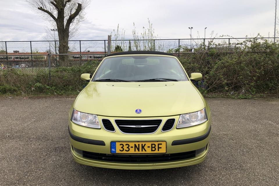 Een SAAB Cabriolet in de introductiekleur Lime Yellow. een unieke Nederlandse auto dealer onderhouden en recent van een nieuw dak voorzien.